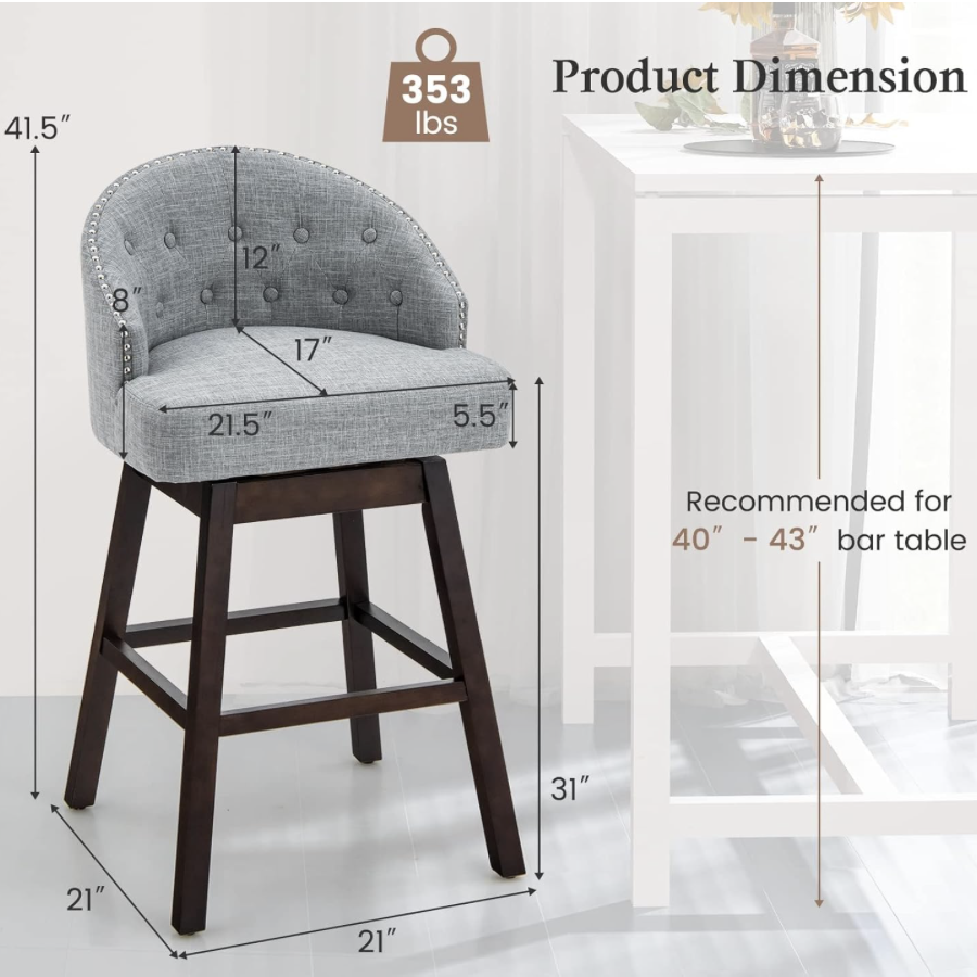- Dimensiones del producto: 21 pulgadas de ancho x 21 pulgadas de profundidad x 41.5 pulgadas de alto. Dimensiones del asiento: 21.5 pulgadas de ancho x 17 pulgadas de profundidad. Altura del asiento: 31 pulgadas de alto. Dimensiones del respaldo: 21.5 pulgadas de ancho x 12 pulgadas de alto. La capacidad máxima de carga es de 353 libras. Nuestros taburetes giratorios son adecuados para la parte superior de barra de 40 a 43 pulgadas. Mide la altura de la barra antes de comprar nuestras sillas de bar.